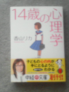 「14歳の心理学」という香山リカさんの本を買いました。文庫です。香山リカさんはテレビにばんばん出てる有名な精神科医です。心理学はrokiが興味深々の分野。手ごろなお値段だったので買いました。まだちょこっとしか読んでないのですがタリウムでお母さんを殺そうとした女の子の話しなど10代のショッキングな事件を精神科医的に解説、解読しています。でもrokiにはそこらへんはちょっとむずい。共感ができないのです。尾崎豊のことも載ってました。今の子供は尾崎豊に共感はしないのです。rokiもしてません。これを期に香山リカさんの文庫本をいろいろ買ってみようかな?なんて思いました。